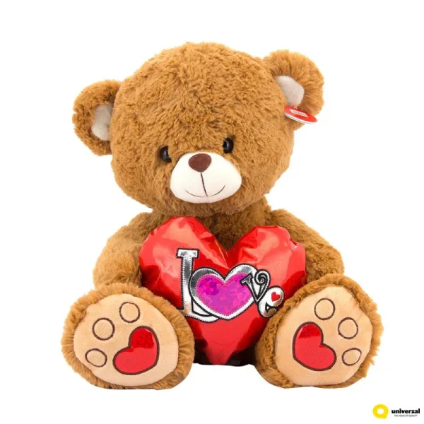 Mekani, plišani meda izrađen je od tekstila. Meda je braon boje i drži crveno srce sa natpisom “Love”.